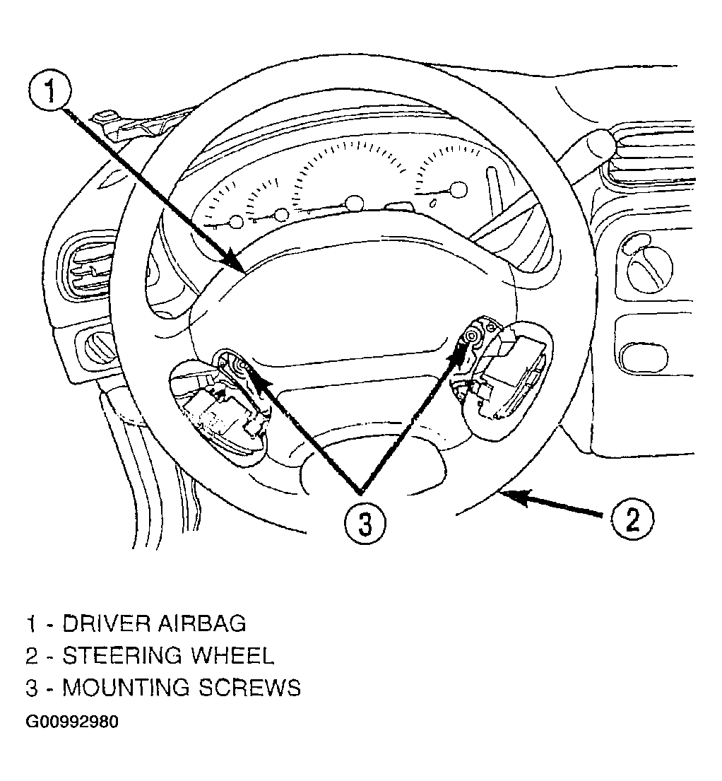 26. Install the airbag module on steering wheel. Install only the two original or correct replacement airbag module attaching bolts (Figure). Tighten the two airbag module attaching bolts to a torque of 8 N.m (75 in. lbs.)