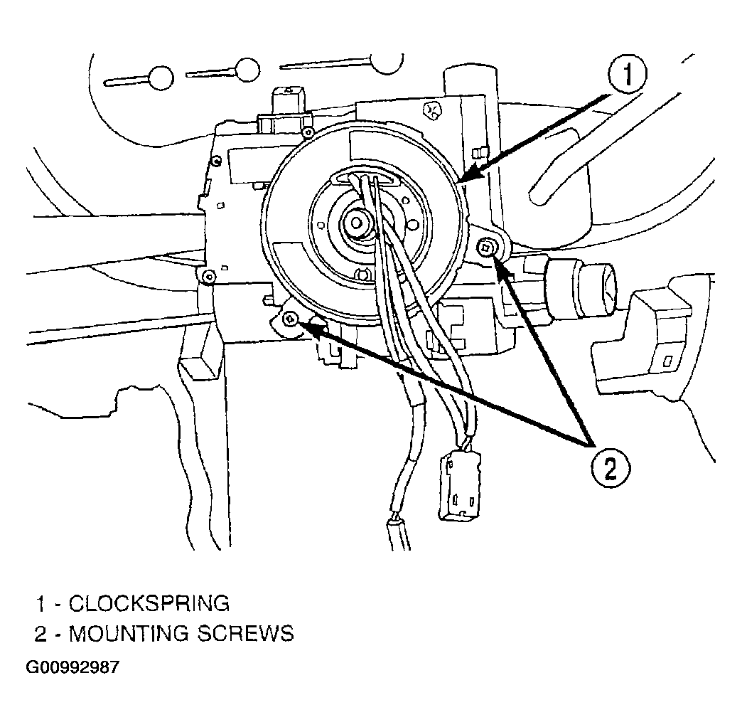 13. Install the clockspring on the steering column. Install and securely tighten the two screws (Figure) mounting the clockspring to the steering column.