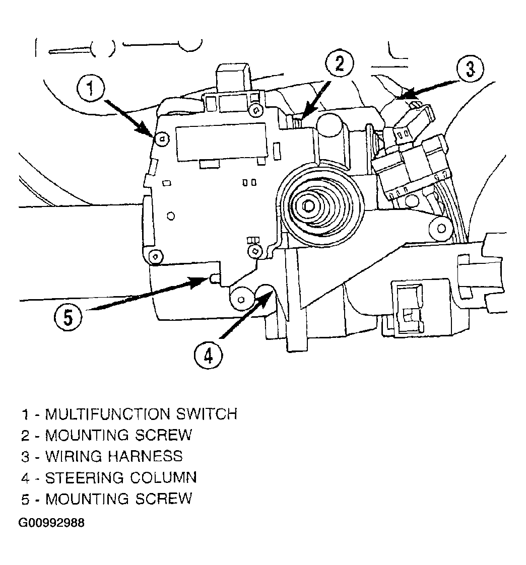 11. Install the multi-function switch on the steering column. Install and securely tighten the two screws (Figure) mounting the multi-function switch to the steering column. Install the clockspring wiring harness on the routing clip on the top of the multi function switch.