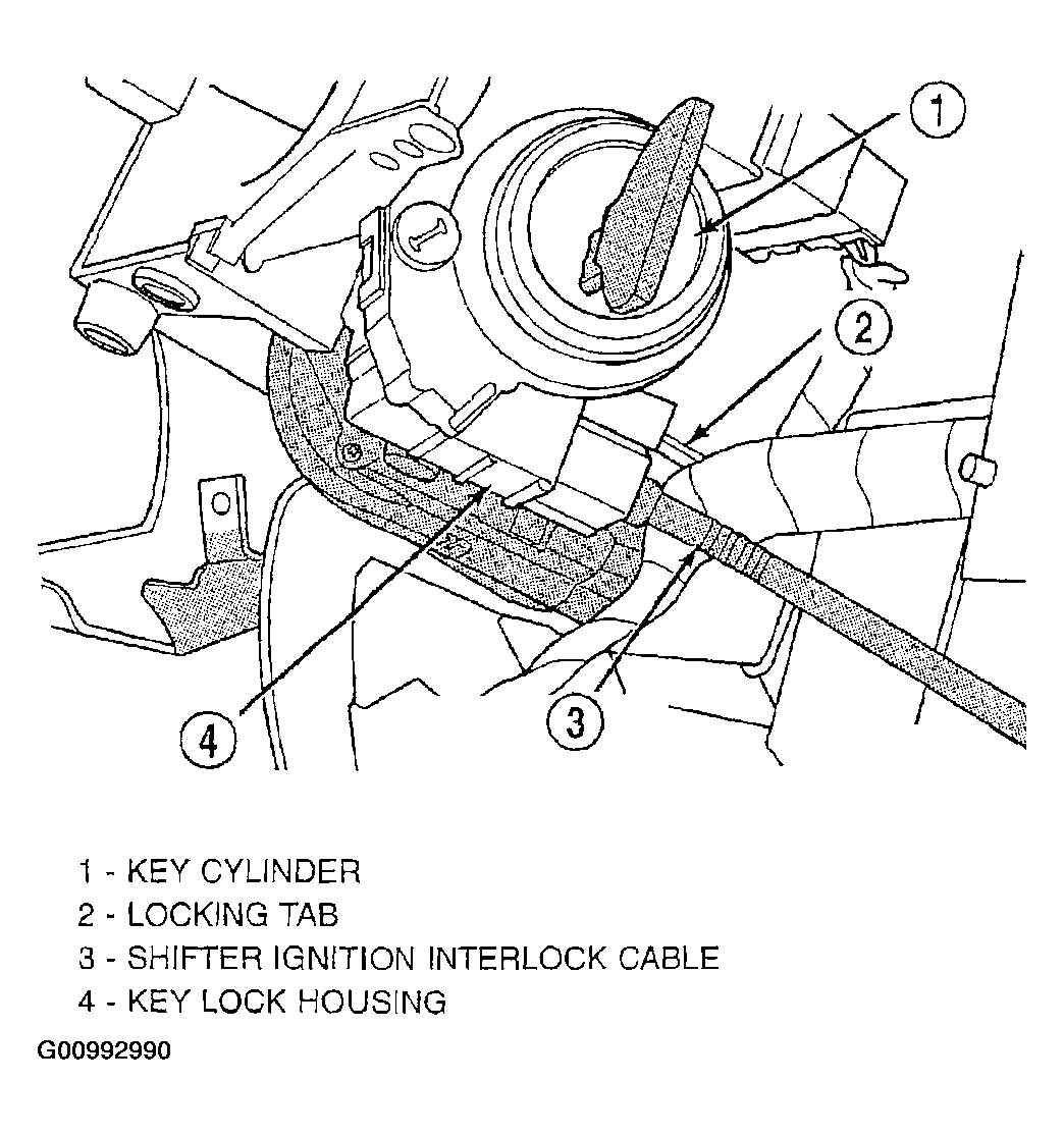 5. If the vehicle is equipped with a floor shifter, install the shifter/ignition interlock cable (Figure) in the lock cylinder housing.