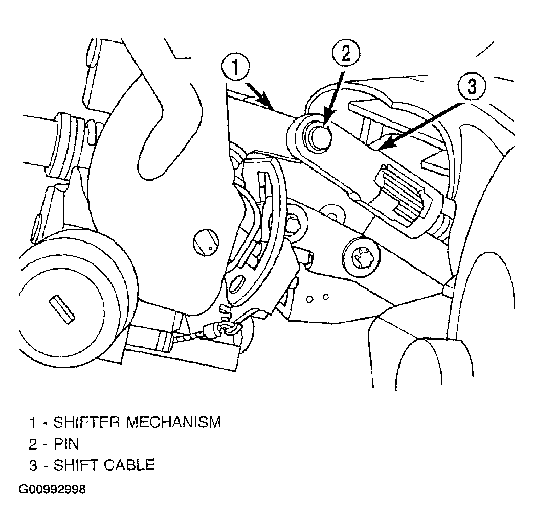 7. If the vehicle is equipped with a steering column mounted shift lever, first verify that the shift lever is locked in the park position. Then, install the shift cable on the shifter mechanism (Fig 1). The shift cable must be fully inserted onto the pin of the shifter mechanism.