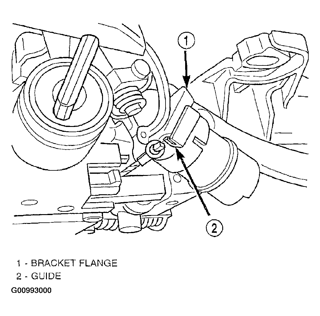 2. Slide the solenoid completely onto the shift lever mounting stud aligning the plastic guide formed into the solenoid housing with the flange on the shift lever mechanism bracket (Fig 3).