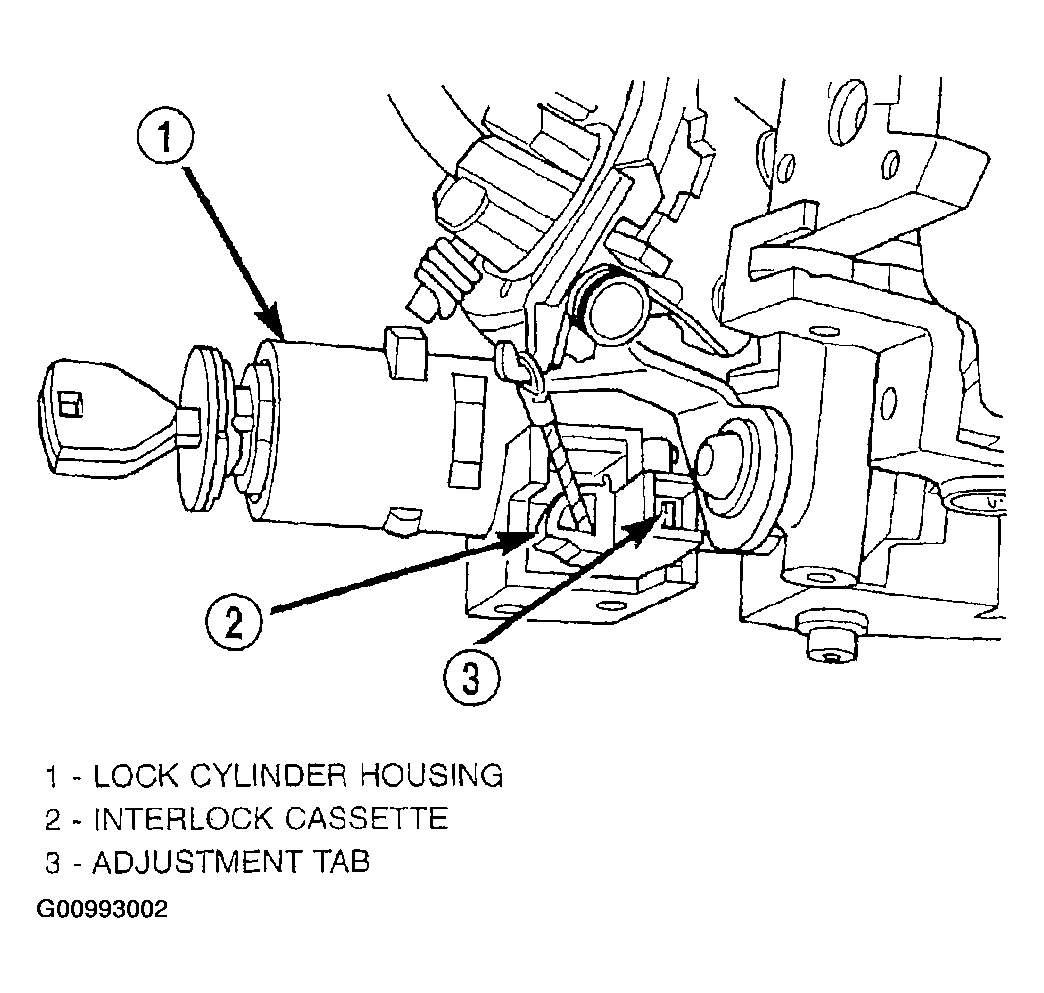 10. If the vehicle is equipped with a steering column mounted shift lever and if a new ignition shift interlock cassette has been installed, the interlock system must be adjusted. Adjust the interlock system by pushing in on the adjustment tab until it stops (Fig 5). The adjustment tab will click as it moves into position. Ensure the tab is fully depressed.
