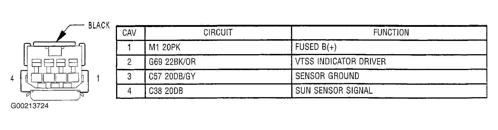 - Disconnect the sun sensor/VTSS LED harness connector. See Figure . With the scan tool, read the sun sensor voltage. If the voltage is .2 volt or less, go to next step. If the voltage is .2 volt or more, replace the sun sensor. See SUN SENSOR under REMOVAL & INSTALLATION.
