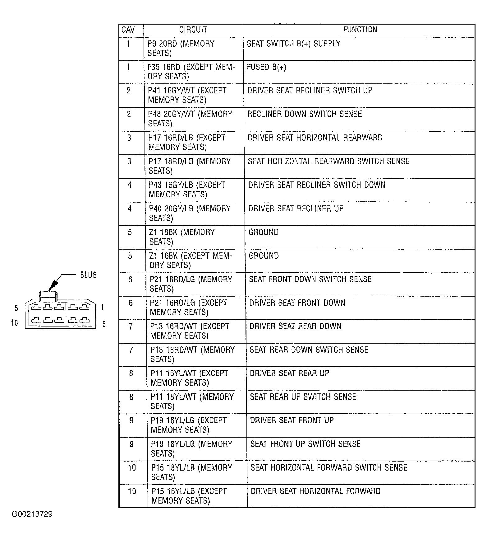1. Turn ignition off. Disconnect power seat switch connector. Turn ignition on. Measure voltage on power seat switch connector terminal No. 3, seat horizontal rearward switch sense circuit (Red/Light Blue wire). See Figure . If any voltage exists, leave power seat switch connector disconnected and go to next step. If no voltage exists, replace power seat switch. See POWER SEATS article.