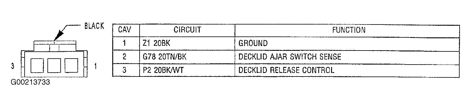 - Turn ignition off. Disconnect deck lid release solenoid/ajar switch connector. Measure resistance between ground and deck lid release solenoid/ajar switch connector terminal No. 1, ground circuit (Black wire). See Figure . If resistance is less than 5 ohms, leave deck lid release solenoid/ajar switch connector disconnected and go to next step. If resistance is 5 ohms or more, repair open in Black wire.