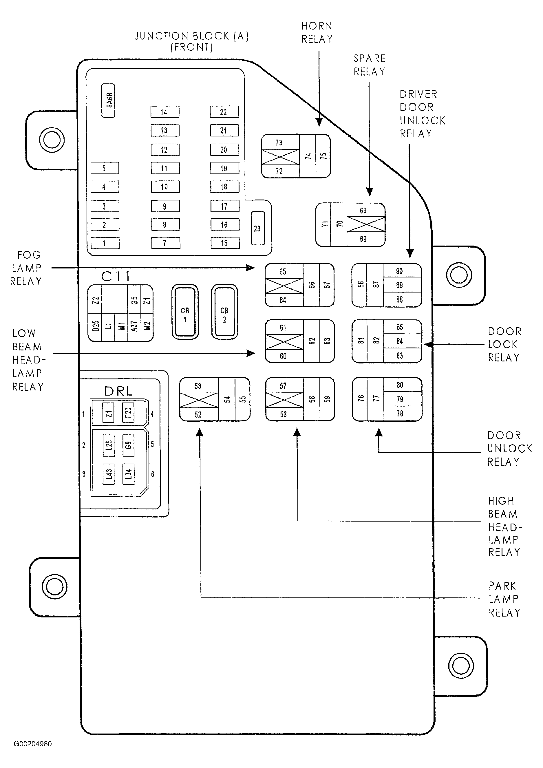 - Turn ignition off. Remove driver door unlock relay from junction block. See Figure and Figure . Connect a 12-volt test light between ground and door unlock relay connector terminal No. 87. If test light illuminates brightly, leave driver door unlock relay removed and go to next step. If test light does not illuminate brightly, replace junction block. See JUNCTION BLOCK under REMOVAL & INSTALLATION.