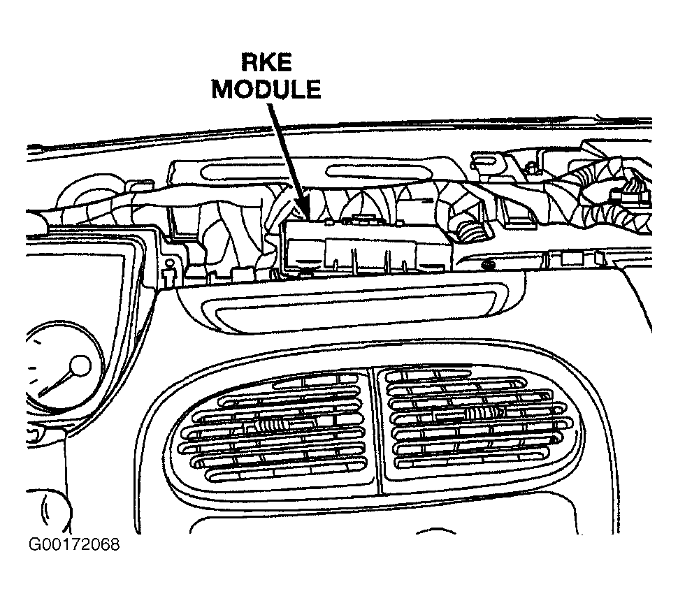 2. Turn ignition off. Disconnect 26-pin Remote Keyless Entry (RKE) module connector, located under center of instrument panel top cover. See Figure . Connect a 12-volt test light between RKE module connector terminal No. 1, dimmer switch low beam output circuit and ground. See Figure . Turn low beam headlights on. If test light illuminates, replace RKE module. See REMOTE KEYLESS ENTRY MODULE  under REMOVAL & INSTALLATION. If test light does not illuminate, repair open wire. After making any repairs, perform VTSS VERIFICATION TEST  under VERIFICATION TESTS.