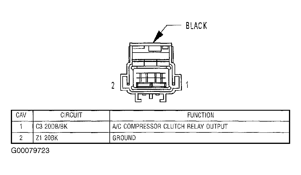 2. Turn ignition off. Disconnect A/C clutch connector. Measure resistance between ground and Black wire at A/C clutch harness connector. See Fig 1 . If resistance is less than 5 ohms, go to next step. If resistance is 5 ohms or more, repair open in Black wire between A/C clutch and ground connection G103.