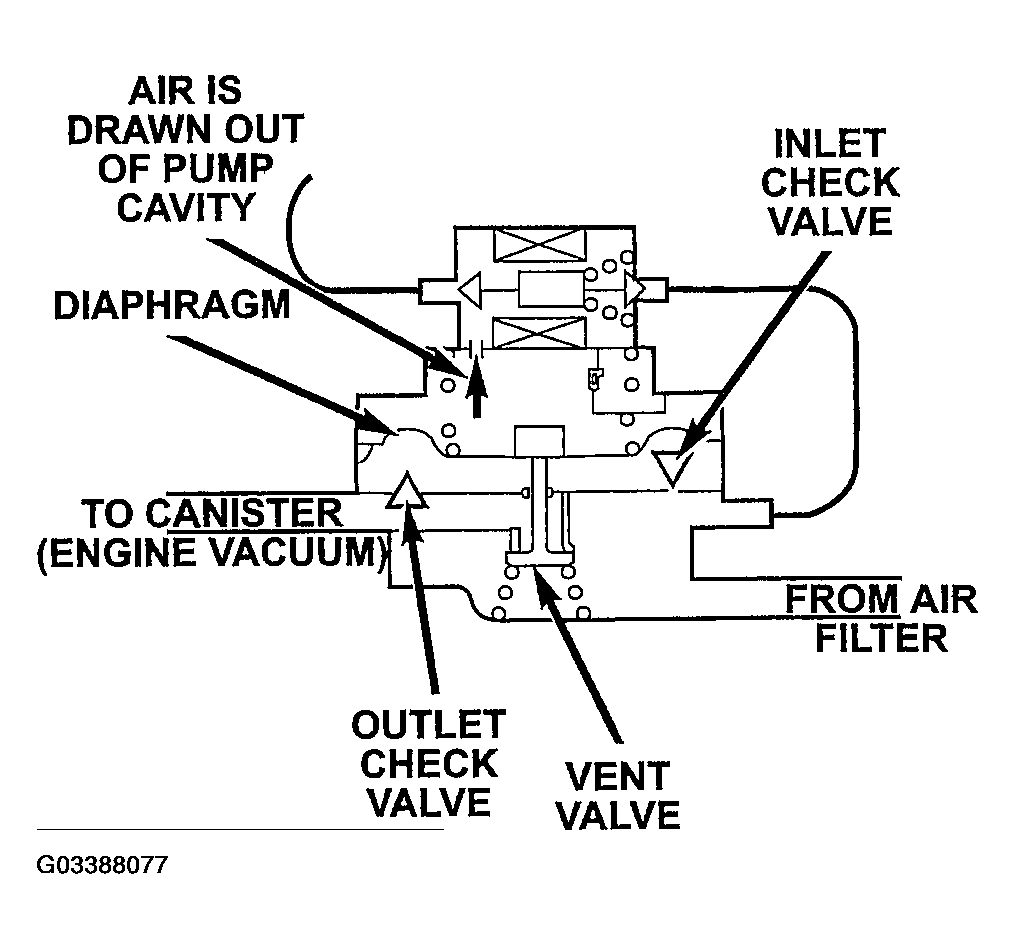 When the PCM energizes the LDP solenoid, the solenoid blocks the atmospheric port leading through the EVAP air filter and at the same time opens the engine vacuum port to the pump cavity above the diaphragm. The diaphragm moves upward when the vacuum above the diaphragm exceeds spring force. This upward movement closes the vent valve. It also causes low pressure below the diaphragm, unseating the inlet check valve and allowing air in from the EVAP air filter. When the diaphragm completes its upward movement, the LDP reed switch turns from closed to open (Fig 1).