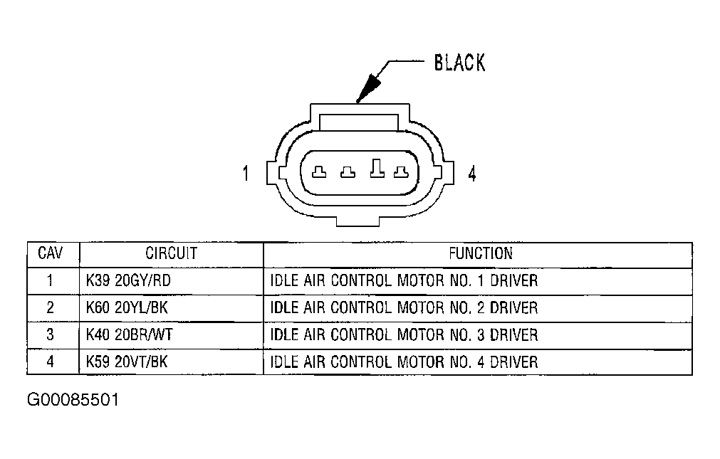 - Turn ignition off. Disconnect IAC motor and PCM harness connectors. IAC motor is located on throttle body. IAC motor is located on side of throttle body. PCM is located on left side of engine compartment, near air filter housing. See Figure . Inspect connectors for damaged pins, corrosion and loose terminals. Repair connectors as necessary. If connectors are okay, measure resistance of each wire between IAC motor harness connector and PCM C2 harness connector. See Figure and Fig 1 . If each resistance is less than 5 ohms, replace IAC motor. If any resistance is 5 ohms or more, repair open in appropriate wire between IAC motor and PCM.