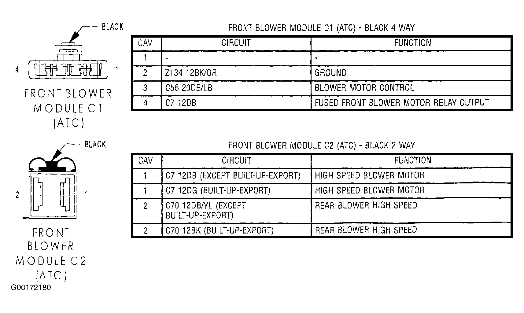 14. Turn the ignition off. Disconnect the Front Blower Power Module C1 harness connector. Disconnect the Front Blower Power Module C2 harness connector. See Fig 1. Connect a jumper wire between the Fused Front Blower Motor Relay Output circuit in the Front Blower Power Module C1 harness connector and the Dark Blue wire in the Front Blower Power Module C2 harness connector. Connect a jumper wire between the Ground circuit in the Front Blower Power Module C1 harness connector and the Dark Blue/Yellow wire in the Front Blower Power Module C2 harness connector. Turn the ignition on. If the Blower Motor operates at full speed, replace the Front Blower Power Module. See appropriate AUTOMATIC A/C-HEATER SYSTEMS article in HVAC. With the DRBIII®, reset the ATC after repair/replacement is complete. If the Blower Motor does not operate at full speed, replace the Blower Motor. See appropriate AUTOMATIC A/C-HEATER SYSTEMS article in HVAC. With the DRBIII®, reset the ATC after repair/replacement is complete.