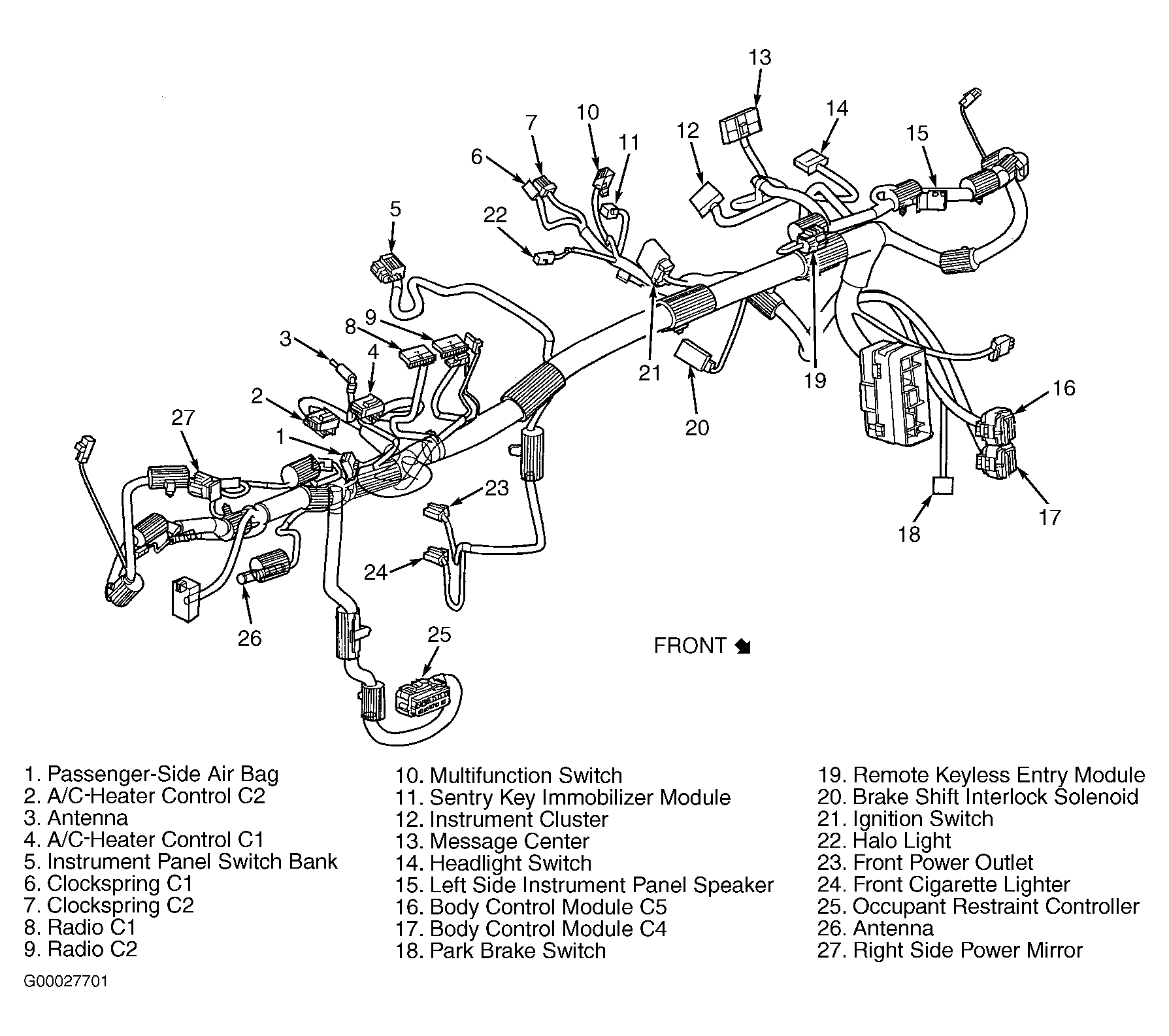 - Turn the ignition off. Disconnect the Ignition Switch 5-way connector. See Fig 1. Disconnect the Body Control Module C4 connector. See Figure. Measure the resistance between ground and the Ignition Switch Sense Return circuit in the BCM C4 connector. If the resistance is below 10 k/ohms, repair the Ignition Switch Sense Return circuit for a short to ground. If the resistance is above 10 k/ohms, replace the Body Control Module. See BODY CONTROL MODULE under REMOVAL & INSTALLATION.