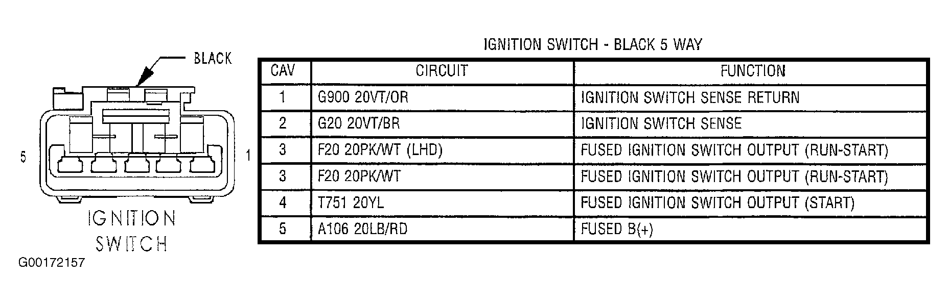 - Turn ignition off. Disconnect ignition switch 5-pin connector. See Figure. Using scan tool, select SENSORS and monitor IGNITION SW voltage. If scan tool displays 0 volts, go to next step. If scan tool does not display 0 volts, replace ignition switch. See IGNITION SWITCH & LOCK CYLINDER under REMOVAL & INSTALLATION in STEERING COLUMN SWITCHES article.