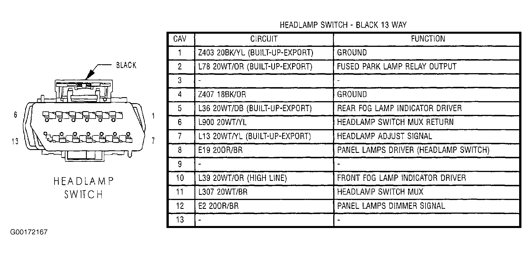 3. Turn the ignition off: Disconnect the Headlamp Switch harness connector. See Figure. Measure the resistance of the Panel Lamps Dimmer Signal Circuit and the Headlamp Switch MUX Return Circuit to ground. If the resistance is below 1000 ohms, replace the headlamp switch. See ANALOG INSTRUMENT PANELS article. If the resistance is above 1000 ohms, replace the Body Control Module. See BODY CONTROL MODULE  under REMOVAL & INSTALLATION.