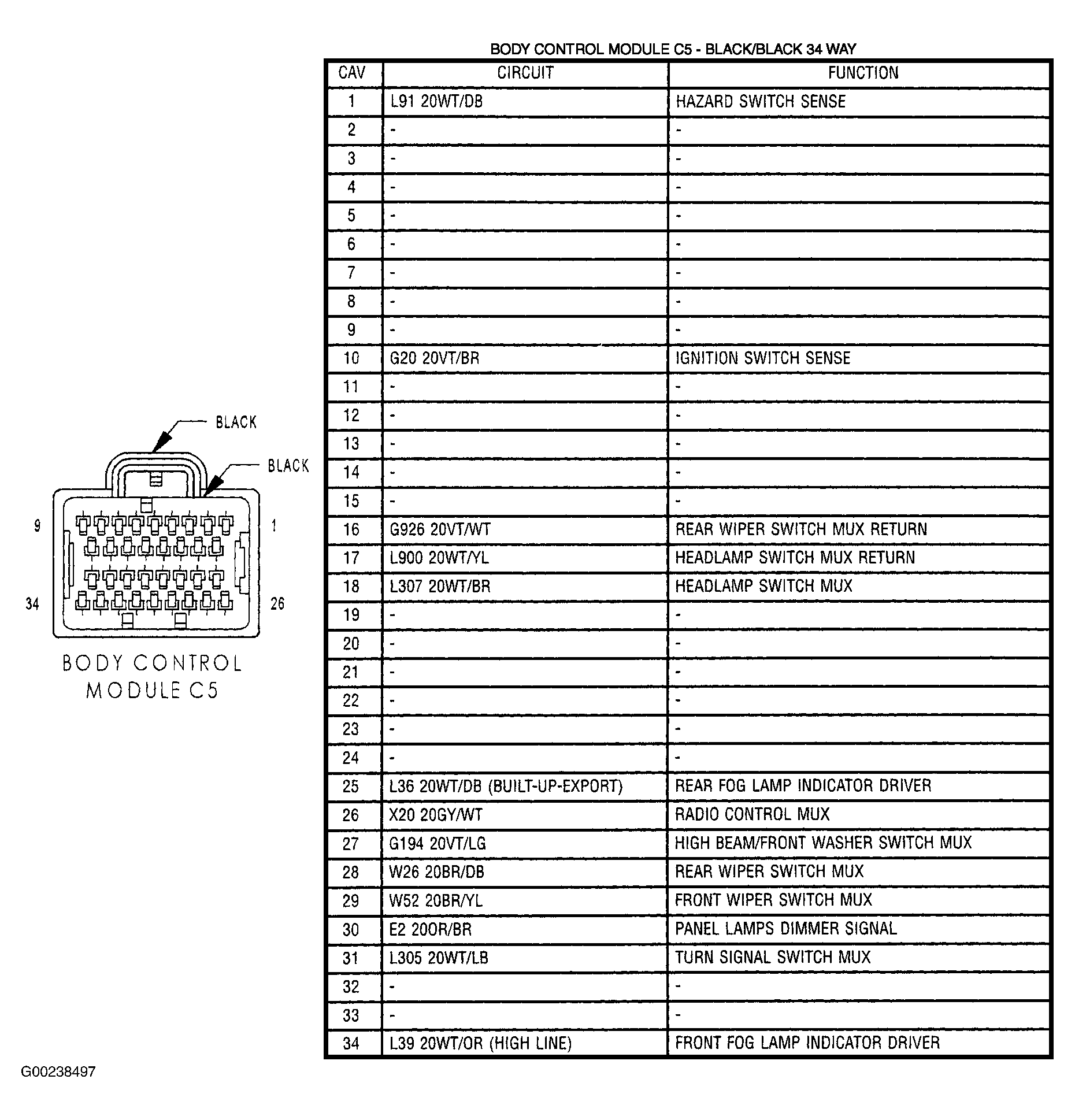 2. Turn the ignition off. Disconnect the Headlamp Switch harness connector. See Figure. Disconnect the Body Control Module C5 connector. See Figure. Measure the resistance of the Panel Lamps Dimmer Signal Circuit to ground. If the resistance is below 1000 ohms, repair the Panel Lamps Dimmer Signal Circuit for a short to ground. If the resistance is above 1000 ohms, go to the next step.