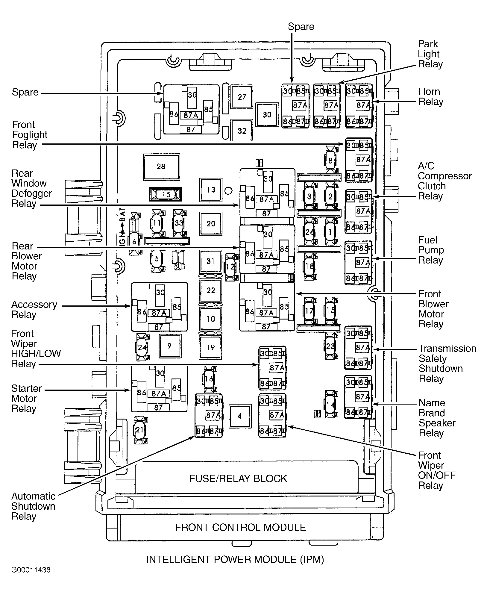 - Turn ignition switch to OFF position. Remove Front Control Module (FCM) from IPM. See Fig 1. Remove front and rear blower motor relays from IPM. Using DVOM, measure resistance between ground and appropriate terminal of IPM for FCM connector cavity No. 30. If resistance is less than 5 ohms, replace Intelligent Power Module (IPM). If resistance is 5 ohms or more, go to next step.