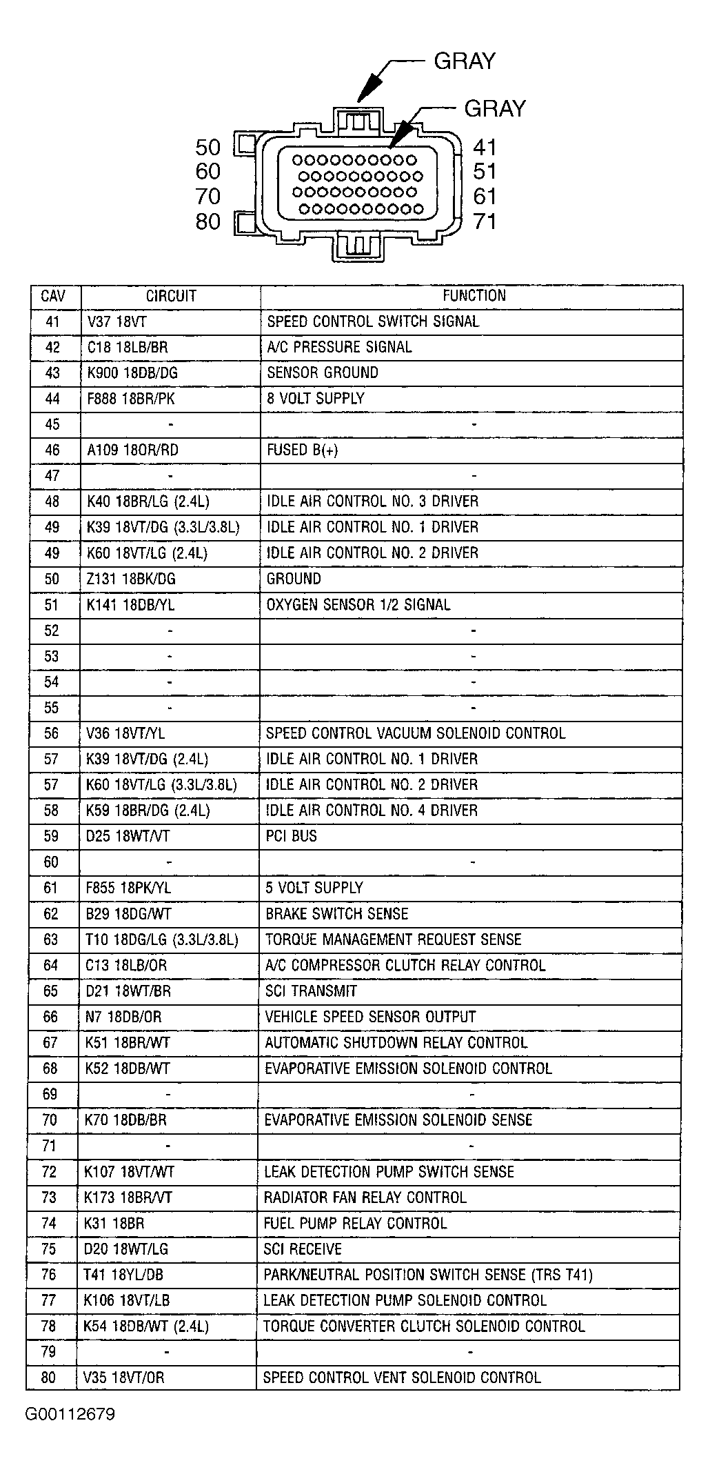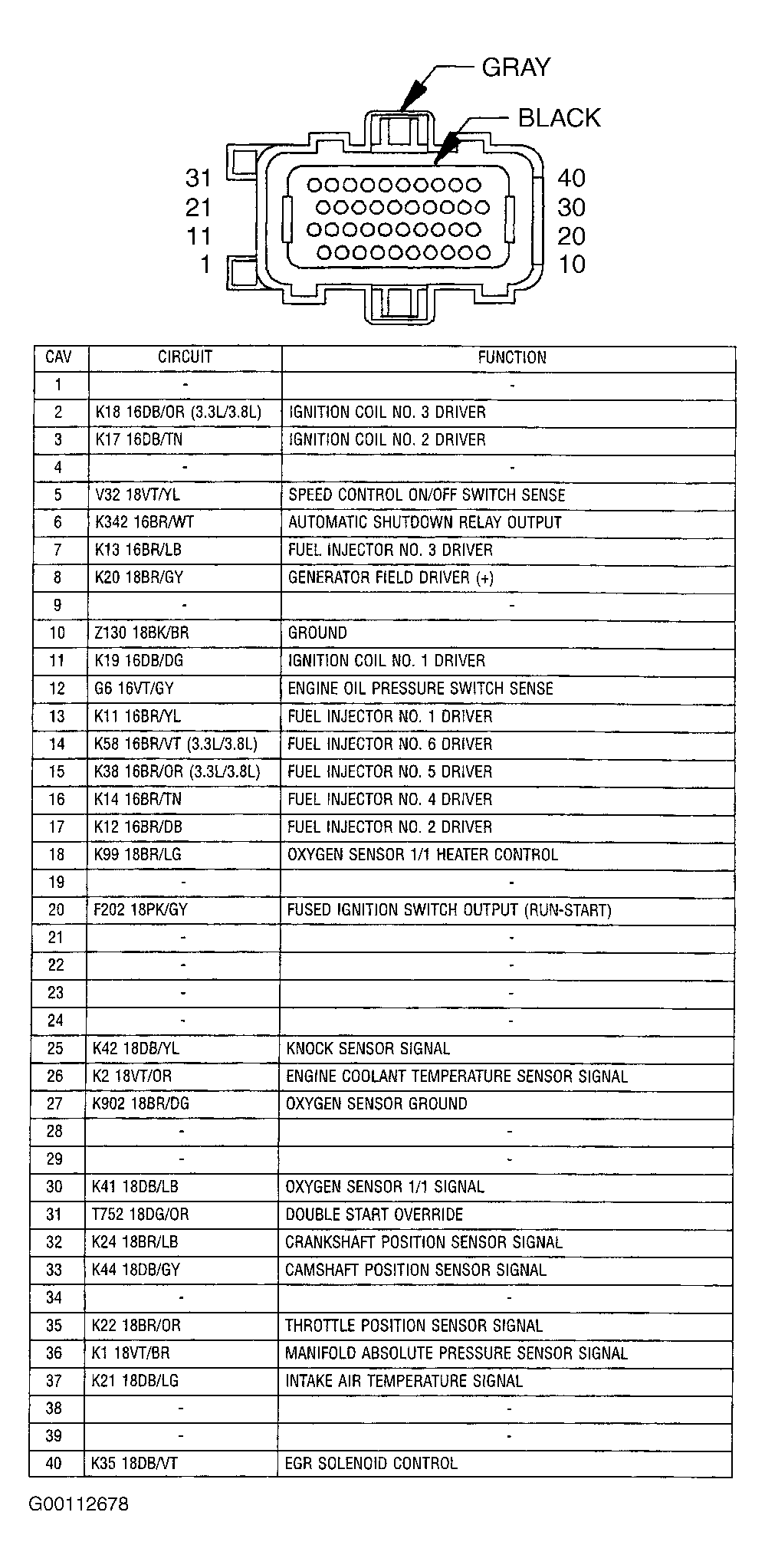 - Turn ignition on. Using a test light connected to ground, probe terminal No. 20 (Pink/Gray wire) at PCM C1 harness connector. See Fig 4. If test light illuminates brightly, power circuits are okay. Go to next step. If test light does not illuminate brightly, repair open fused ignition switch output circuit (Pink/Gray wire) between PCM and IPM.