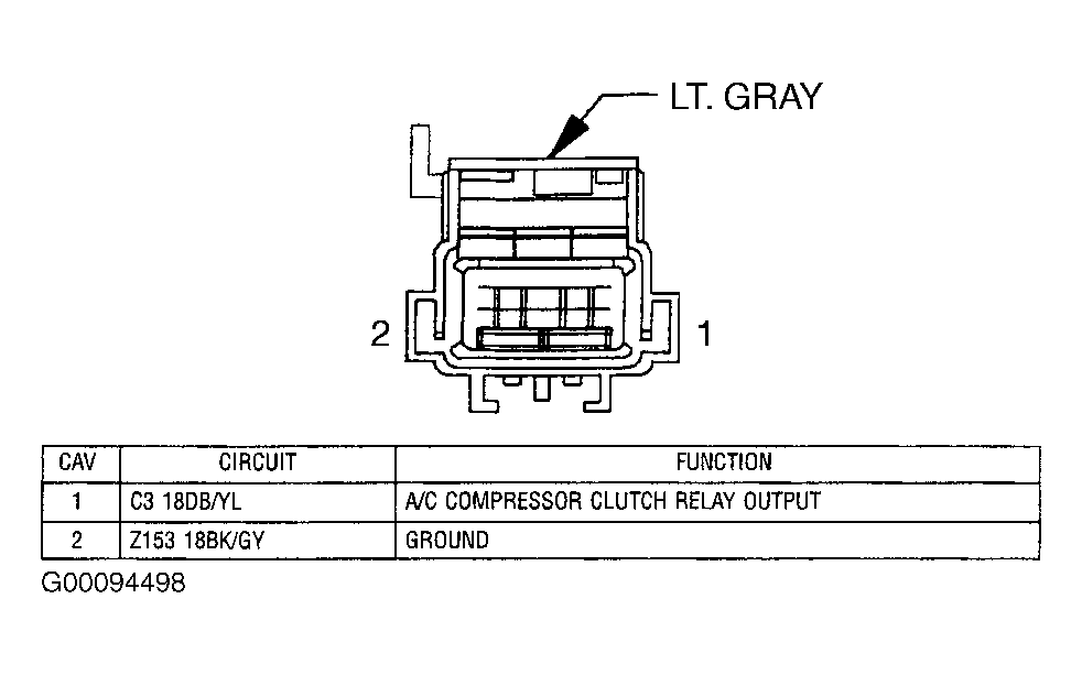 - Turn ignition off. Disconnect A/C clutch connector. Measure resistance between ground and Black/Gray wire at A/C clutch harness connector. See Fig 1. If resistance is less than 5 ohms, go to next step. If resistance is 5 ohms or more, repair open in Black/Gray wire between A/C clutch and ground connection. Ground connection is located above starter.