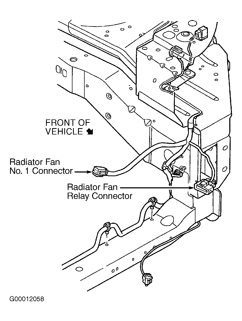 1. Turn ignition off. Disconnect radiator fan relay connector. Radiator fan relay is located near driver's side frame rail. See Fig 1. Connect a jumper wire between Orange/Red and Dark Blue/Dark Green wires at radiator fan relay harness connector. If one or both radiator fans is not operating, go to next step. If both radiator fans operate, no problem is indicated at this time. Test is complete.