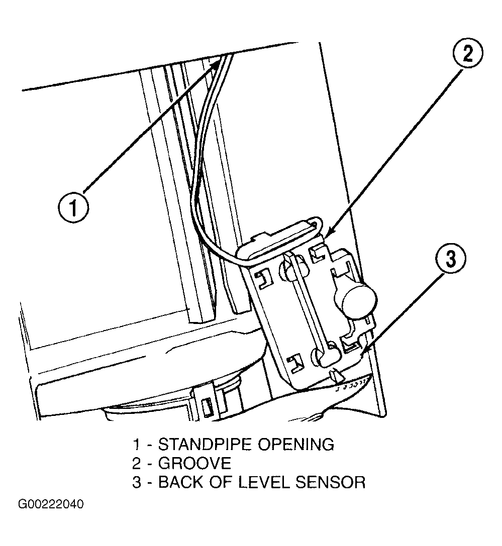 - Insert level sensor wires in bottom of standpipe. Wrap wires into groove in back of level sensor. See Fig 1.