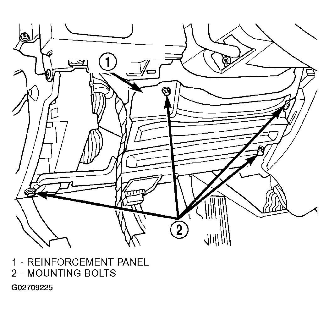 30. Install the reinforcement on the instrument panel (Figure ). Install the four bolts mounting the reinforcement to the instrument panel.