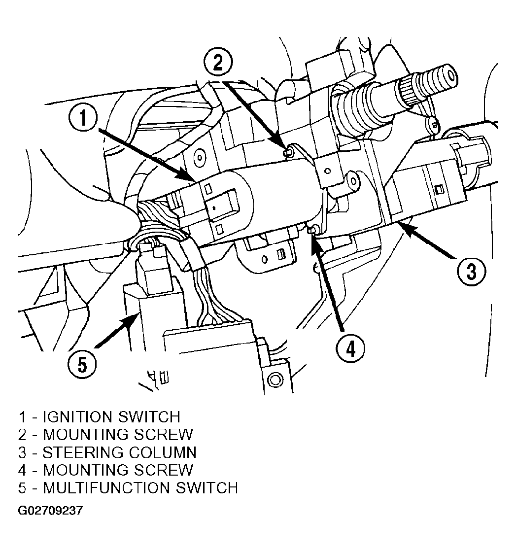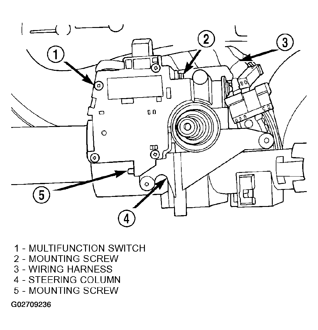 11. Install the multifunction switch on the steering column. Install and securely tighten the two screws (Figure ) mounting the multifunction switch to the steering column. Install the clockspring wiring harness on the routing clip on the top of the multifunction switch.