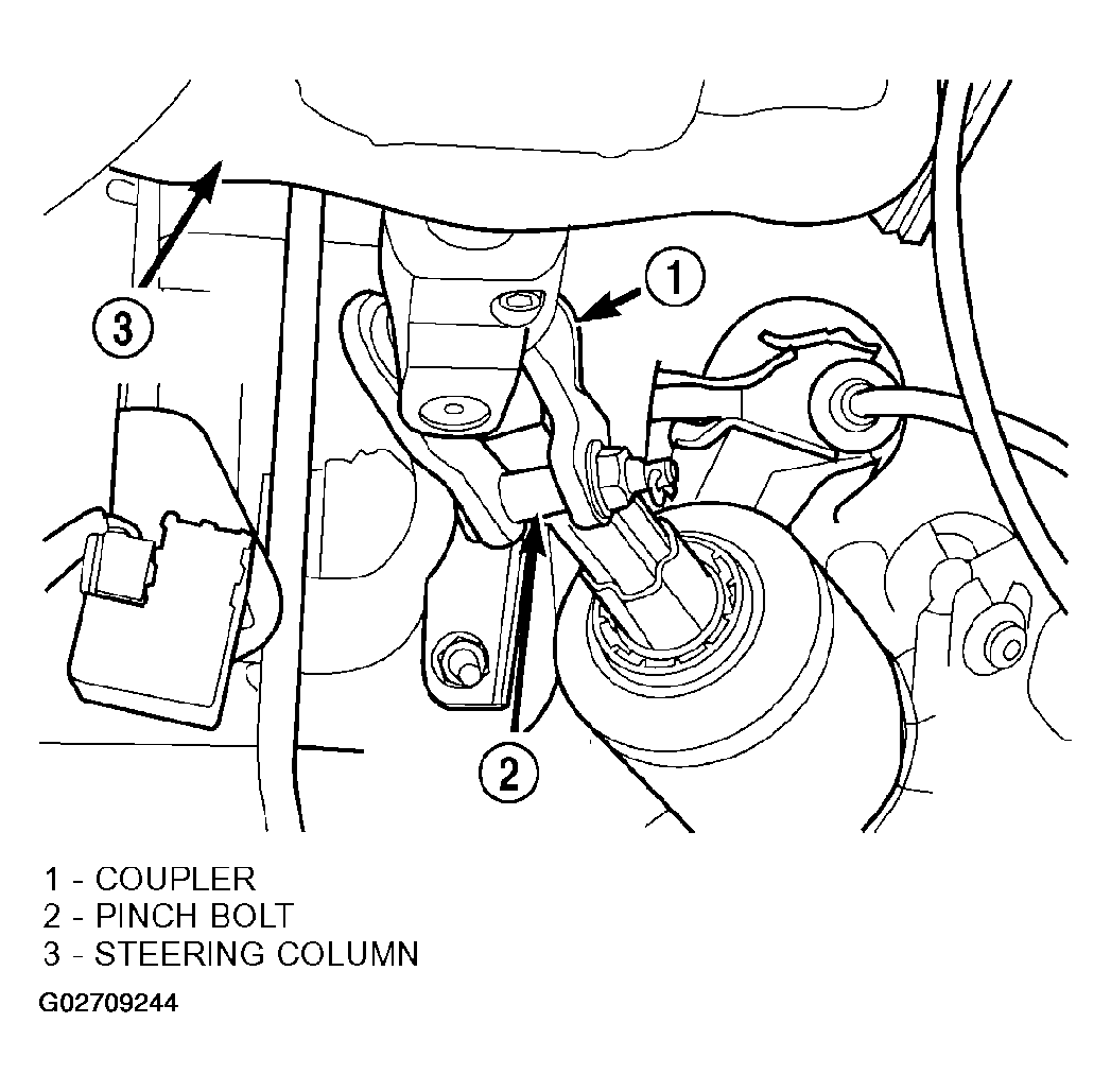 3. Assemble the intermediate steering shaft to the steering column flex coupler (Figure ). Tighten the coupler pinch bolt nut to a torque of 27 N.m (240 in. lbs.). Be sure to install steering coupler pinch bolt retaining pin.