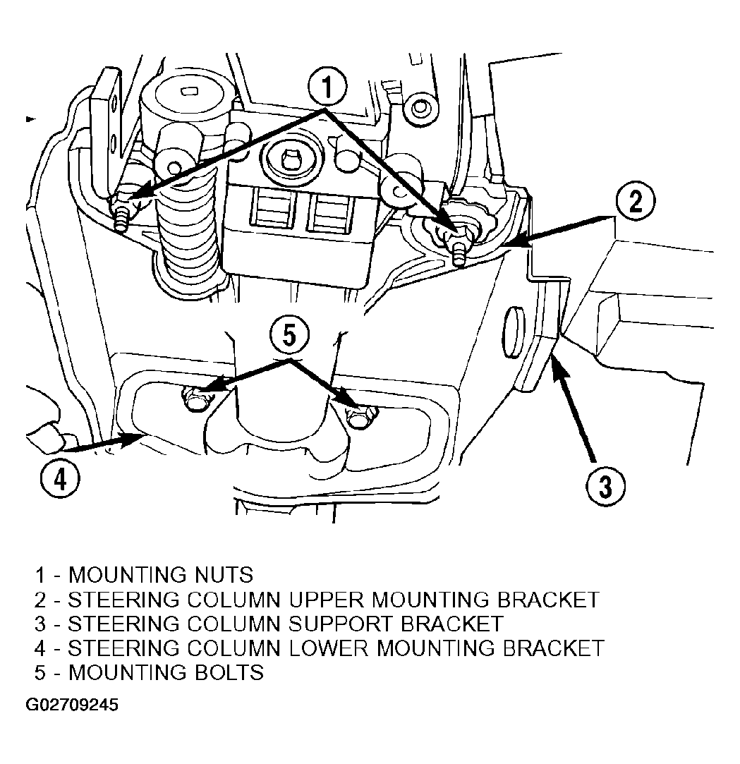 2. Loosely tighten the two steering column upper mounting nuts (Figure ) to hold the steering column in place. Center the steering column in place, side to side, then install the two lower mounting bolts (Figure ). Then equally tighten both steering column upper mounting nuts until upper steering column mounting bracket is seated against support bracket. Tighten the four steering column bracket to support bracket fasteners to 12 N.m (105 in. lbs.), tightening the upper mounting nuts first, then the lower mounting bolts.
