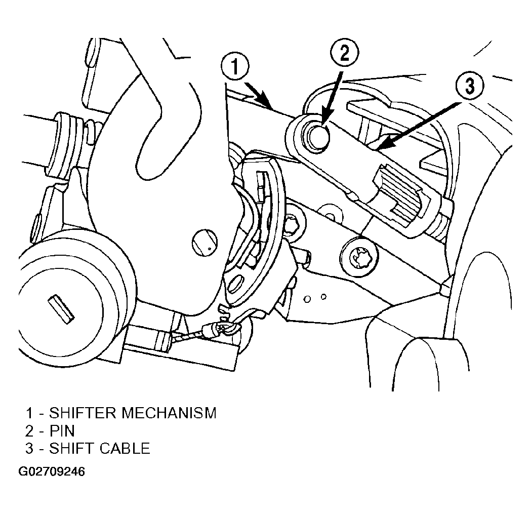 7. If the vehicle is equipped with a steering column mounted shift lever, first verify that the shift lever is locked in the park position. Then, install the shift cable on the shifter mechanism (Fig 1 ). The shift cable must be fully inserted onto the pin of the shifter mechanism.