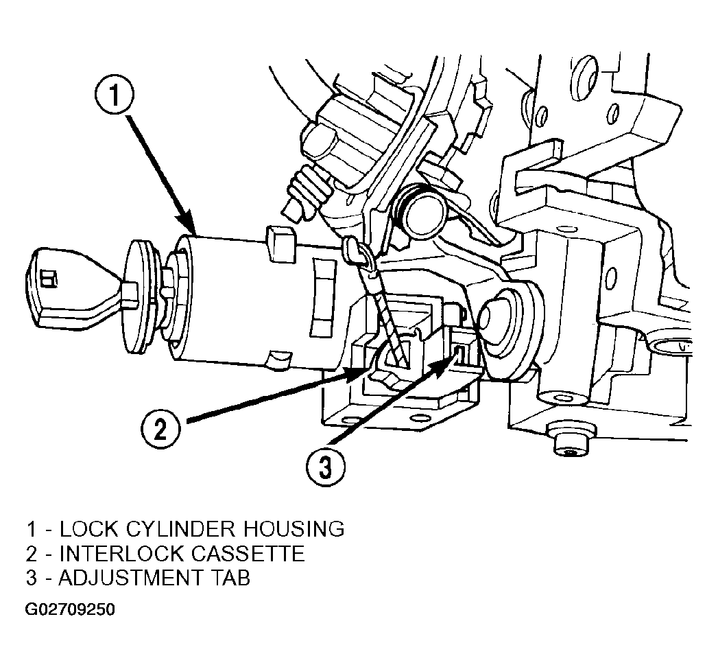 10. If the vehicle is equipped with a steering column mounted shift lever and if a new ignition shift interlock cassette has been installed, the interlock system must be adjusted. Adjust the interlock system by pushing in on the adjustment tab until it stops (Fig 5 ). The adjustment tab will click as it moves into position. Ensure the tab is fully depressed.