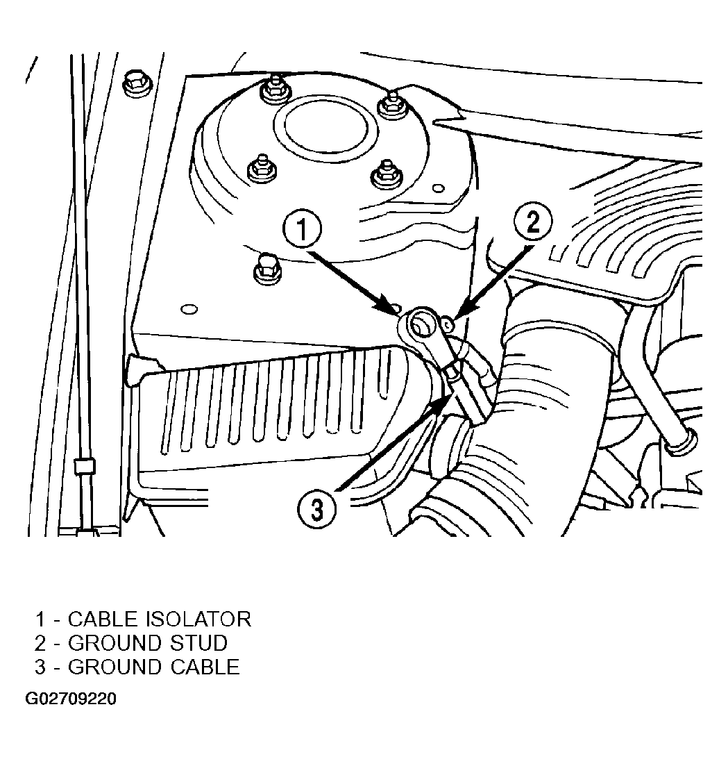 1. Remove remote ground cable from ground stud on shock tower and isolate ground cable from vehicle by installing isolator on stud (Fig 1 ).