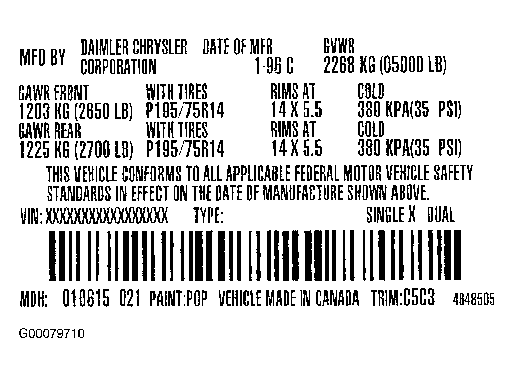 A vehicle safety certification label is attached to every DaimlerChrysler Corporation vehicle. See Fig 1. The label certifies that the vehicle conforms to all applicable Federal Motor Vehicle Safety Standards. The label also lists the following.