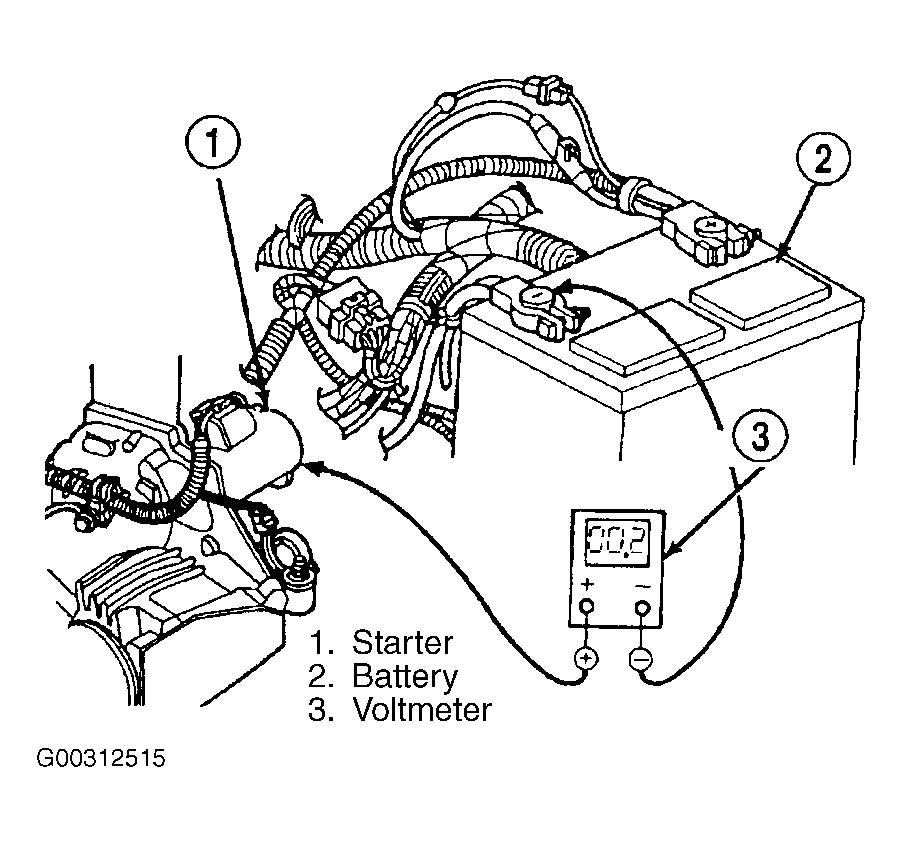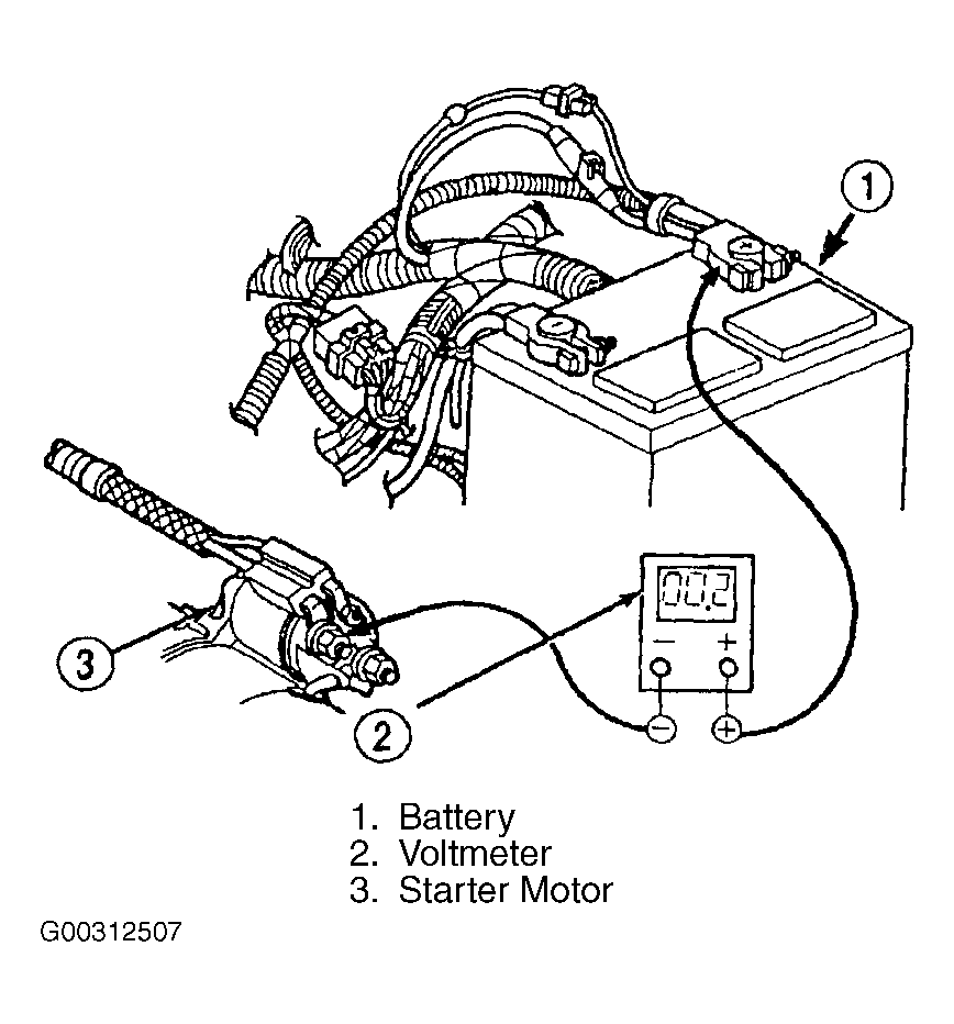 - Connect the voltmeter (2) to measure between the battery (1) positive terminal post and the starter (3) solenoid battery terminal stud. Rotate and hold the ignition switch in the Start position. Observe the voltmeter. If the reading is above 0.2 volt, clean and tighten the battery cable connection at the solenoid. Repeat the test. If the reading is still above 0.2 volt, replace the faulty battery positive cable. See Fig 3 .