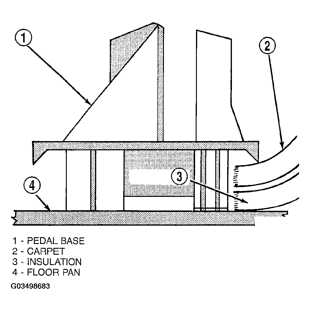 1. Position accelerator pedal assembly over studs onto dash panel. Ensure carpet and insulation are trapped between the lip of the pedal base and the floor plan (Fig 1). Install mounting nuts and tighten to 12 N.m (105 in.lbs.) torque.