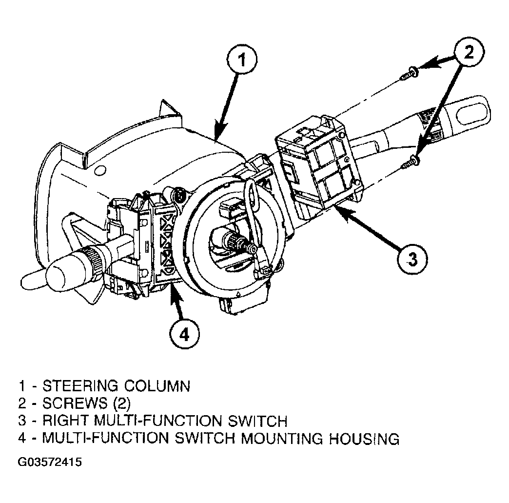 - Install the two screws that secure the right multi-function switch to the multi-function switch mounting housing. Torque the screws to 2.5 N.m (22 in. lbs.).