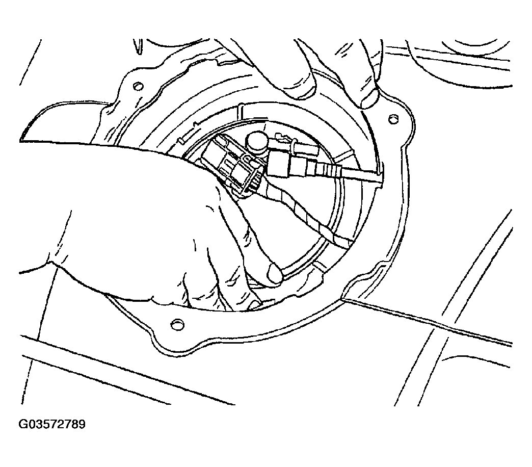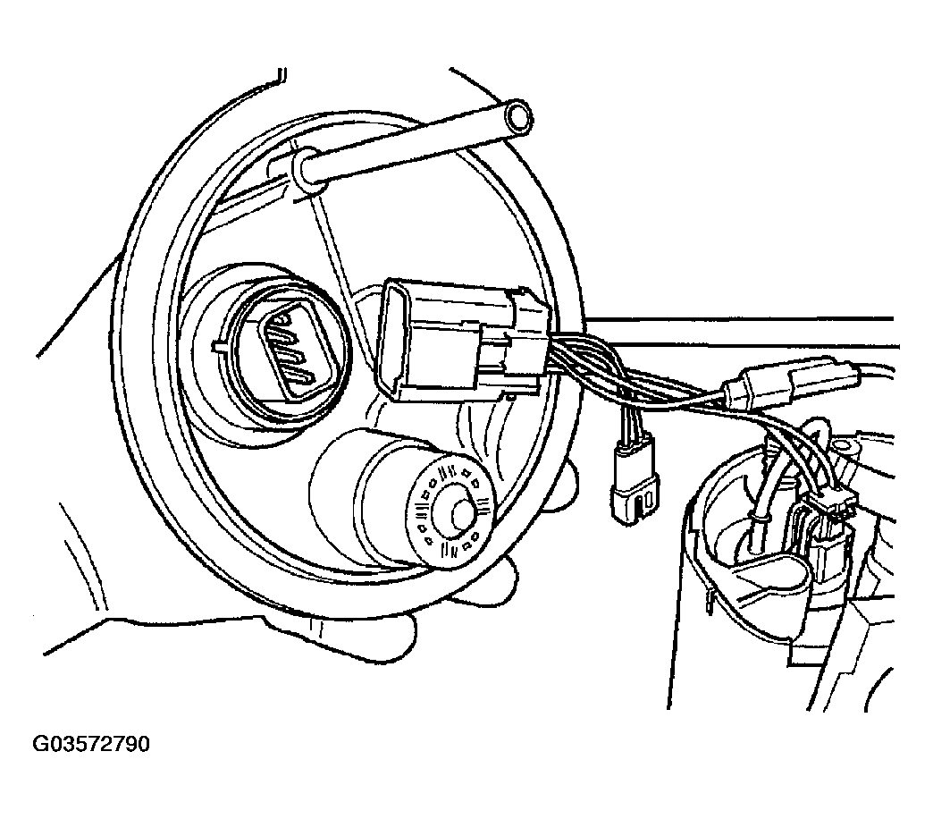 - Remove the fuel line from the top of the pump module. Use a small screwdriver to pry tab back and tip hose to one side and then pry the tab on the other side back to release the hose.