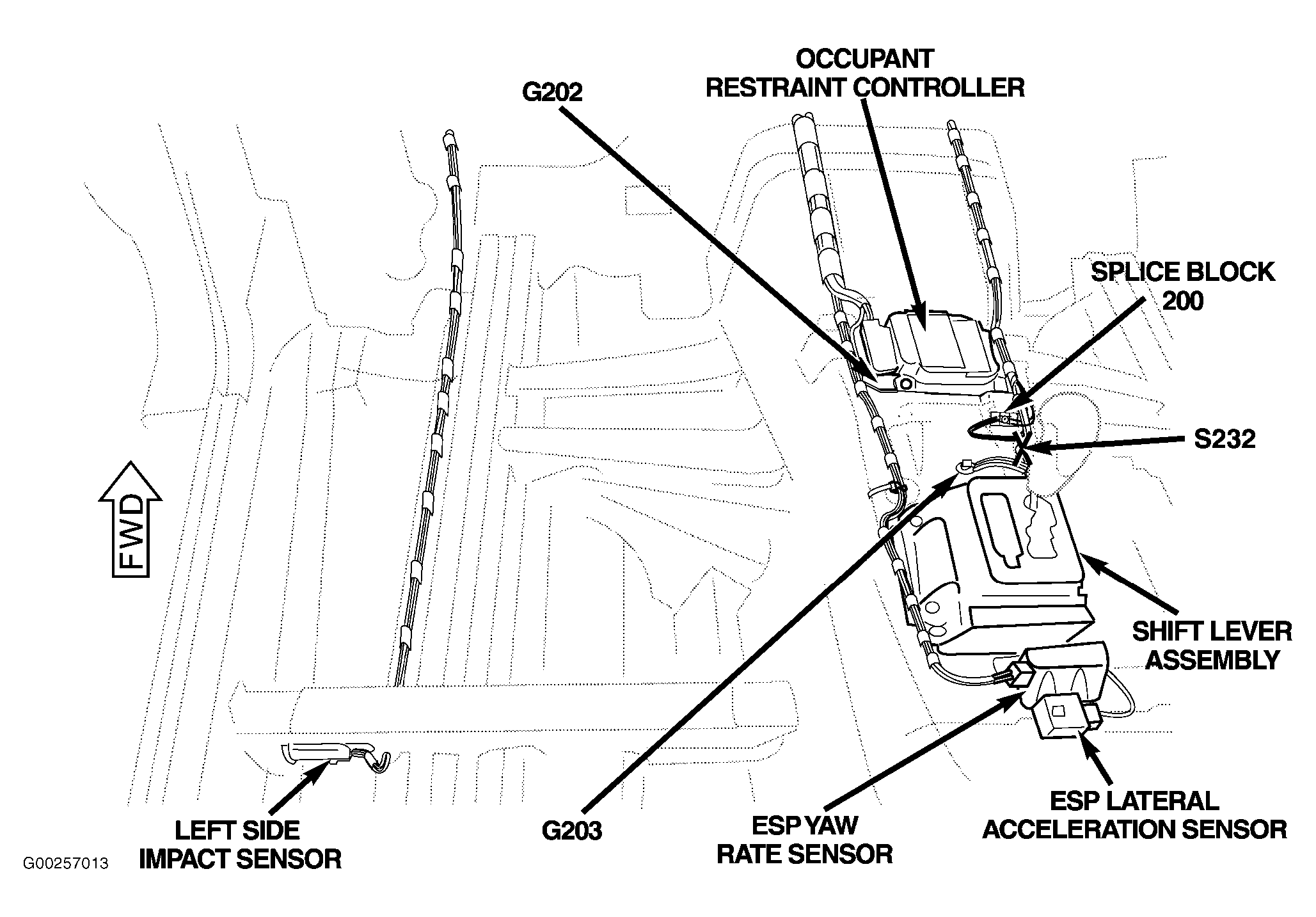 | Splice Block 200 | Under center console. See Figure. |
