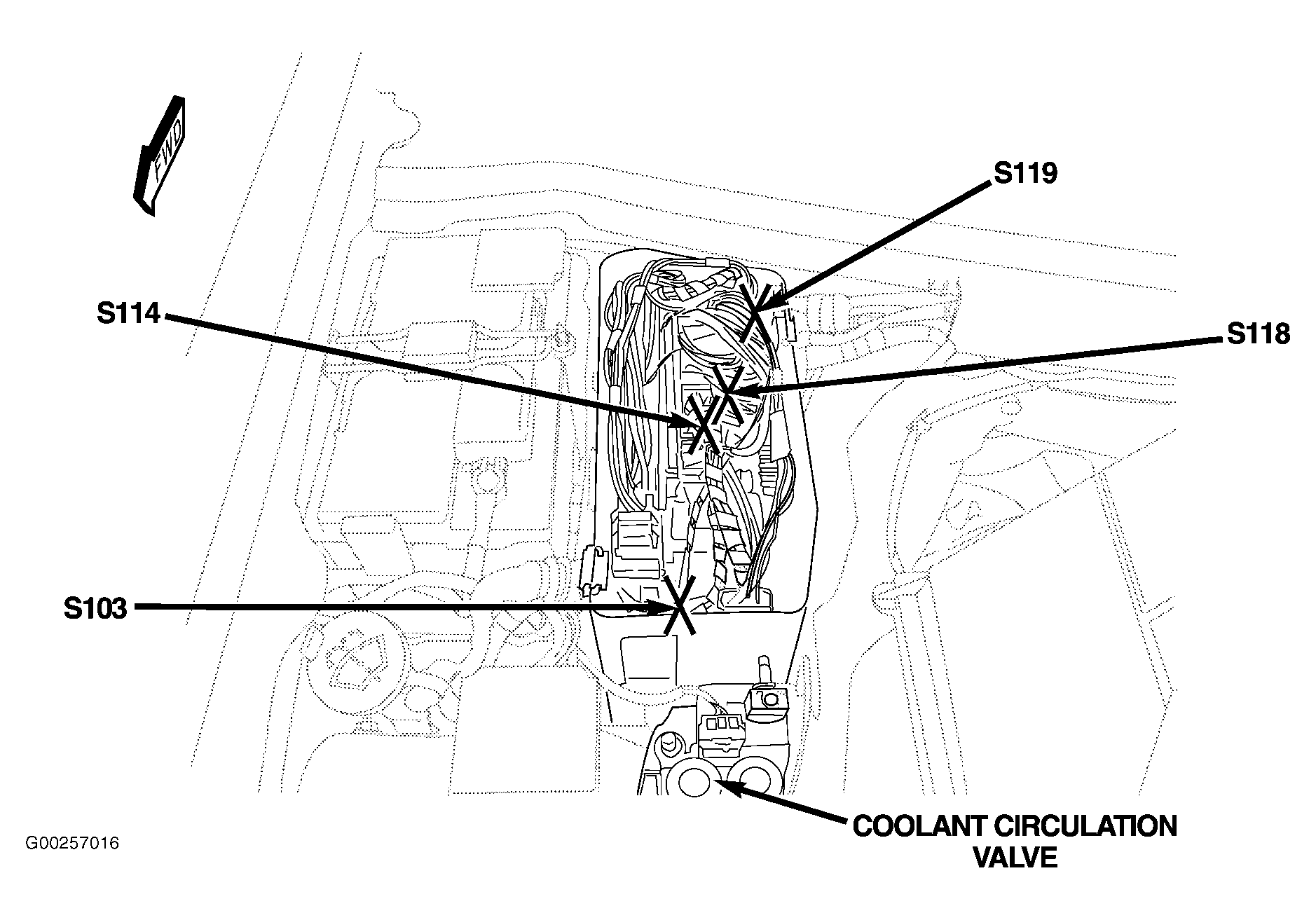 | S119 | At right side of engine compartment. See Figure. |