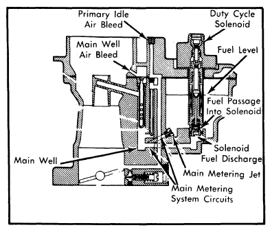 All models are equipped with feedback carburetors which contain an electronically operated duty cycle solenoid. This solenoid meters the main fuel system of carburetor and operates in parallel with the conventional fixed main metering jets. The computer controls the operation of the solenoid with electrical signals, in response to signals received from data sensors. See Fig 1 .