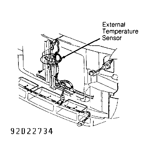 1. Turn ignition switch to ON position. If compass/mini-trip screen displays "OC", go to step 5). If compass/mini-trip screen does not display "OC", turn ignition switch to OFF position. Disconnect external temperature sensor. See Fig 1 . Check connector, and clean or repair connector as necessary. Turn ignition switch to ON position. If compass/mini-trip screen displays "OC", replace external temperature sensor.