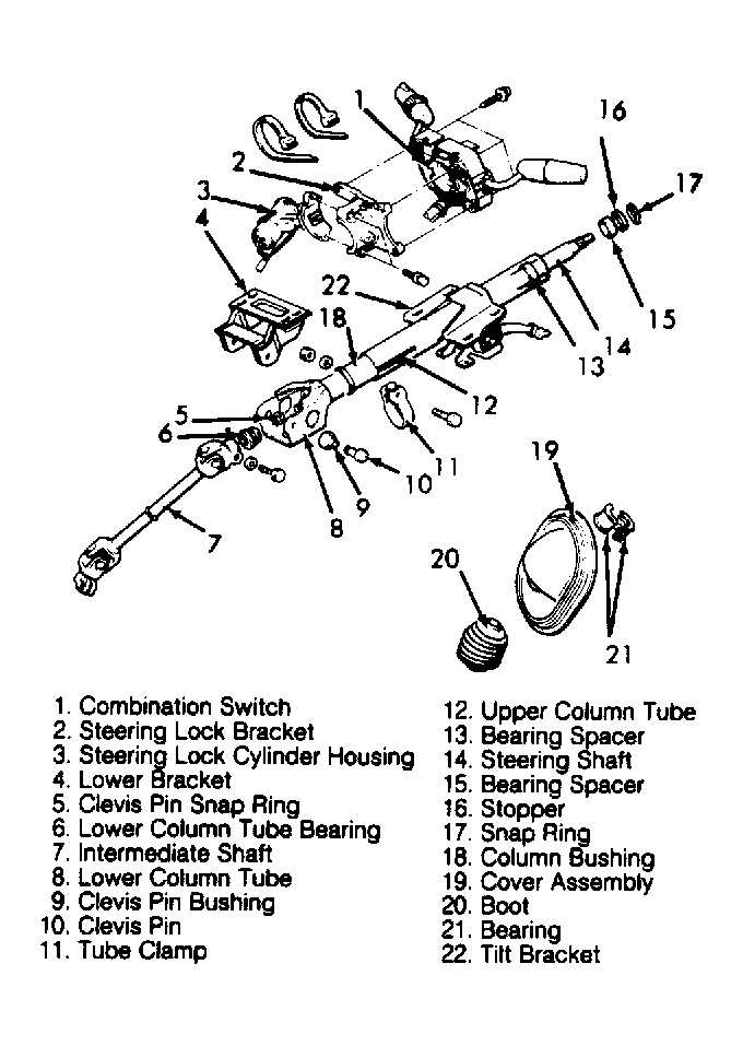 - Remove snap ring, stopper and bearing spacer from top of steering shaft. Remove tube clamp, upper column tube and steering shaft. Remove bearing spacer and column bushing.