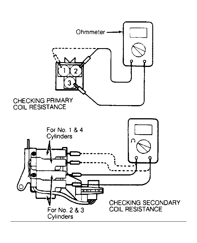 - Measure secondary coil resistance between high voltage tower terminals for No. 1 and No. 4 cylinders, and between high voltage tower terminals for No. 2 and No. 3 cylinders. See Fig 1