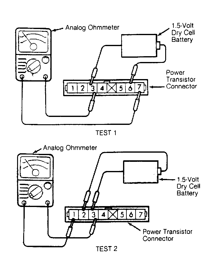 - Check for continuity with dry cell battery connected and disconnected. Continuity should exist with battery connected. No continuity should exist with battery disconnected. If transistor(s) do not test as described, replace power transistor(s).