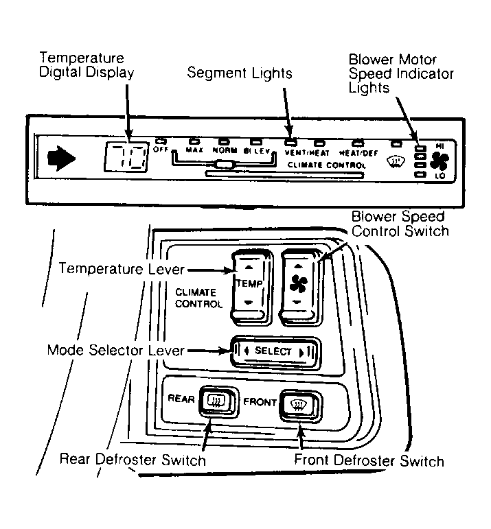 This module consists of 12 bar-type light indicators and a 2 digit temperature light digital display. See Figure . It has 8 mode functions and 4 blower speed settings indicators. This display is located on the instrument panel.