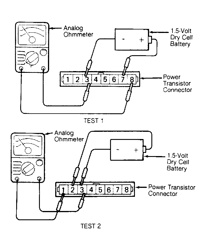- To check power transistor for cylinders No. 1 and 4, connect analog ohmmeter leads between power transistor terminals No. 3 and 8. See Fig 1, TEST 1. Using a 1.5-volt dry cell battery, connect negative lead to terminal No. 3.