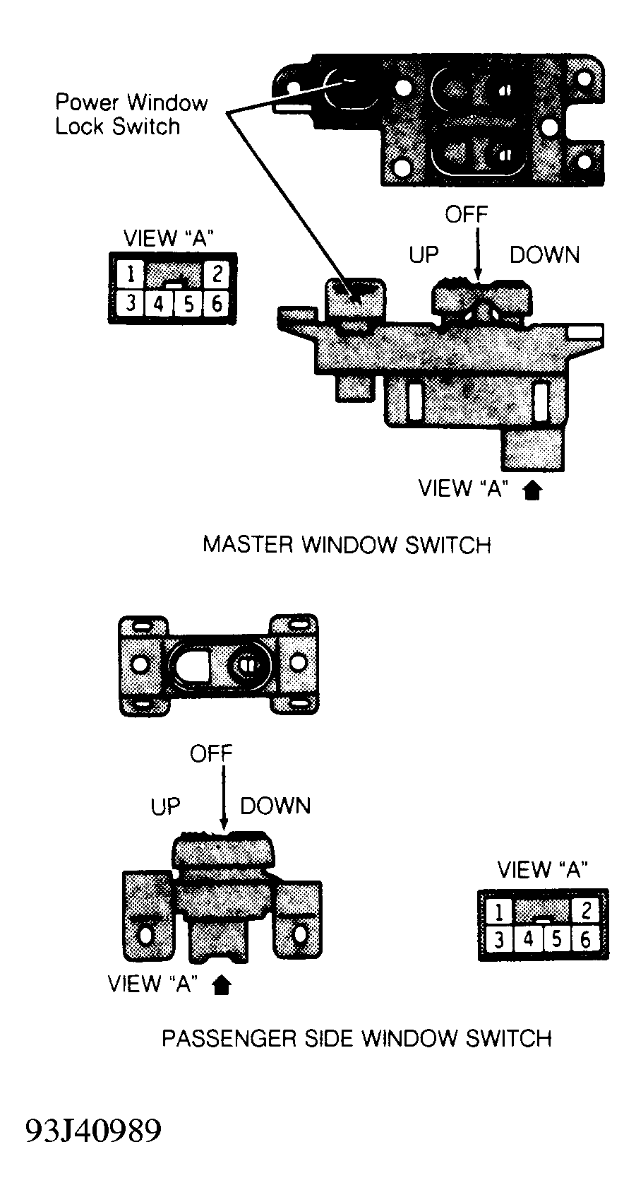 Remove control switch from trim panel. Using ohmmeter, check continuity of switch. See MASTER WINDOW SWITCH CONTINUITY or PASSENGER SIDE WINDOW SWITCH CONTINUITY and Fig 1 . Replace appropriate switch as necessary if switch continuity is not as specified.