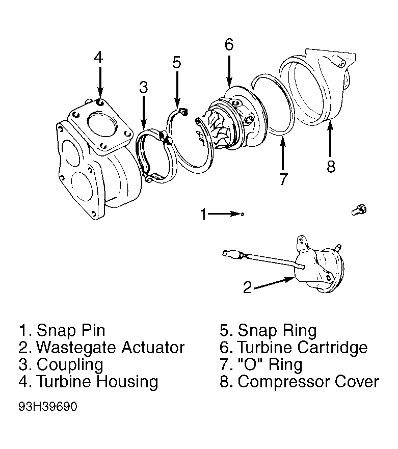 - Remove snap pin. See Fig 1 . Remove wastegate actuator bolts and actuator. Remove coupling from turbine housing. Remove turbine housing. Position compressor cover assembly with end surface facing down, and carefully remove snap ring.