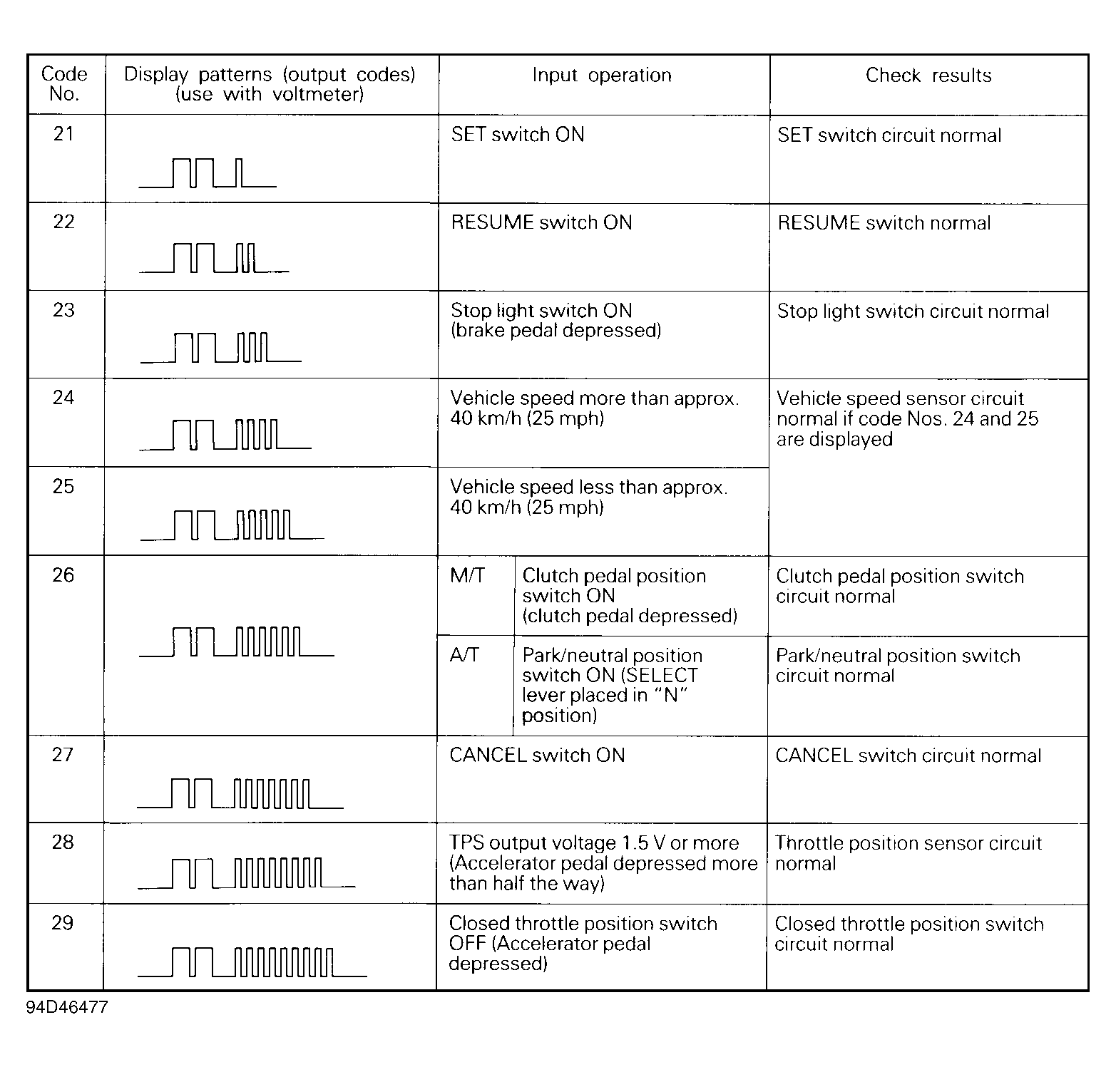 - Turn cruise control switch to ON position and within one second, turn resume switch to ON position. Perform each switch input test as specified in INPUT CODE CHART. See Fig 1