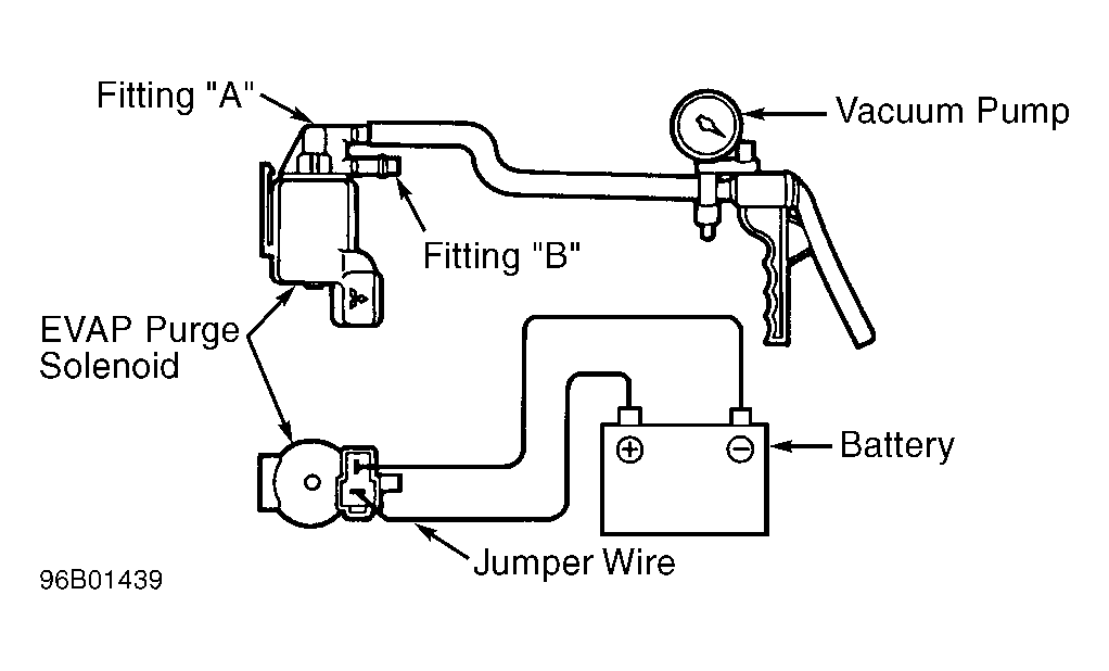 - Using jumper wires, apply battery voltage to electrical terminals on EVAP purge solenoid while applying vacuum to fitting "A". See Fig 1